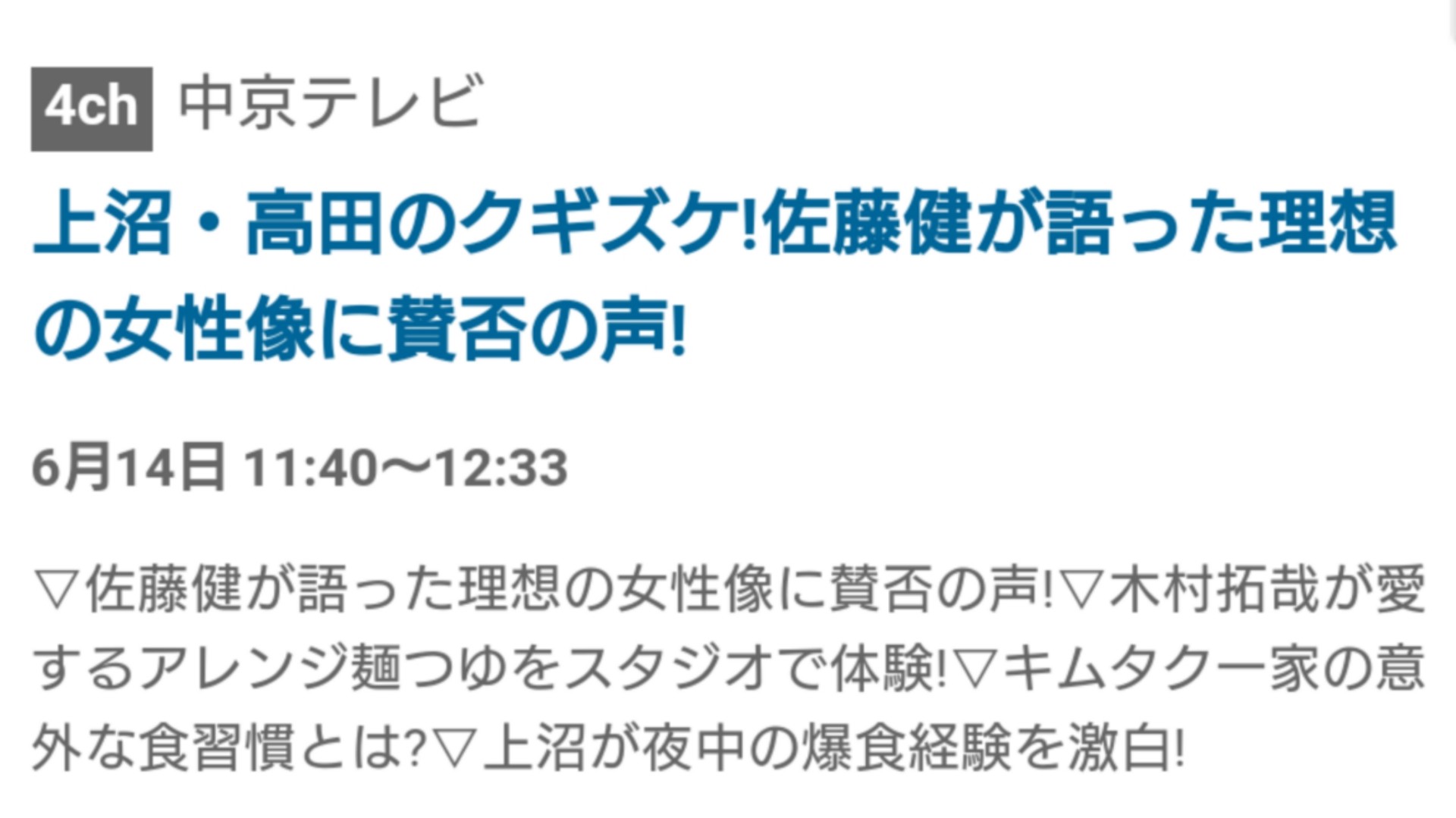 Rin On Twitter 上沼 高田のクギズケ 2020年6月14日 日 11 40 12 33 地域によって異なります 佐藤健が語った理想の女性像に賛否の声 木村拓哉が愛するアレンジ麺つゆをスタジオで体験 他 佐藤健 Https T Co 4msab6xq2o Https T Co Lqzrc9v93y